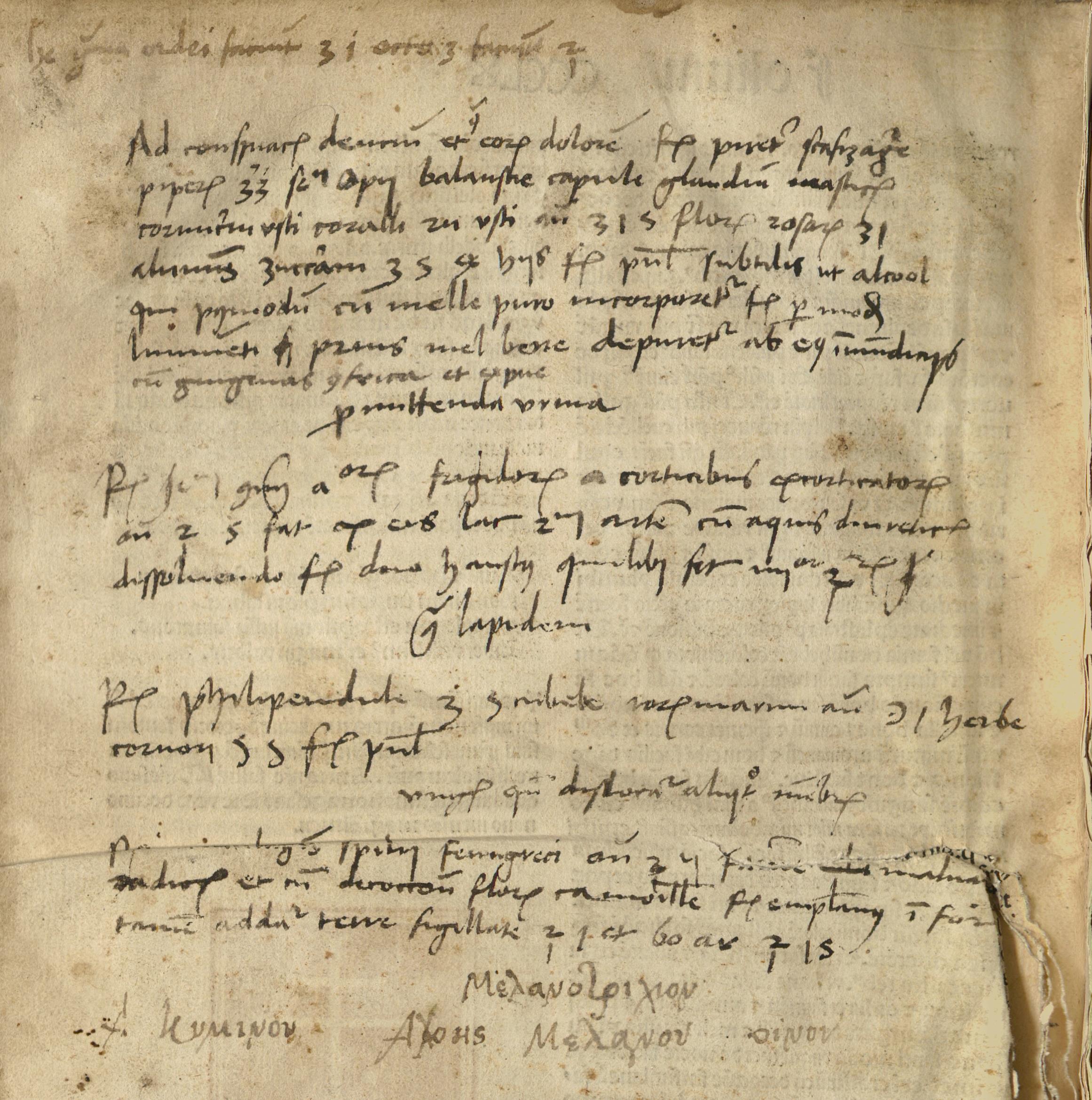 Copernicus’s Annotation Annotation ID: 8 Authentic: Authentic Non-Authentic Unknown Volume: Czartoryski number: 10 Library: Uppsala. Sign: Copernicana 7 https://www.alvin-portal.org/alvin/view.jsf?pid=alvin-record:80884 Book: ID: 1 Author: Tarenta, Valascus de. Title:Practica siue Philonium https://www.alvin-portal.org/alvin/view.jsf?pid=alvin-record:80884 URL: #https://www.alvin-portal.org/alvin/imageViewer.jsf?dsId=ATTACHMENT-0370&pid=alvin-record:80884# Folio: 360v Transcription: lx grana ordei faciunt 3 i, octo 3 faciunt i Ad conseruacionem dentium et contra eorum dolorem Recipe piret(ri), scafizagere, piperis, z(in)z(iberis), semen apij, balaustie, capule glandium, masticis, cornucerui vsti, coralli ru(bri) vsti ana 5 j s(emis), florum rosarum 3 j, aluminis, zuccarum 3 s(emis),ex hijs fiat pul(vis) subtilis ut alco[f]ol, qui postmodum cum melle puro incorporetur, fiat per mod(um) linimenti, sed prius mel bene depuretur ab eius immundicijs, turn gingiuas confrica et expue. Pro mittenda vrina Recipe seminum communium a(mygdal)orum frigidorum a corticibus excorticatorum ana ? s(emis), fiat ex eis lac secundum artem cum aquis diureticis dissoluendo, fiant duo haustus, quilibet sit minor i j. Contra lapidem Recipe philipendule 3 s(emis), cubebe, roris marini ana } j, herbe cornerj 5 s(emis), fiat pul(vis). vng(uentum) quando dislocatur aliquod membrum Recipe mirtilaginis, spilij, Fenugreci ana 3 ij, Farine maluarum radicis, et cum decoccione florum camomille fiat emplastrum, in fortamen(tum) addatur terre sigillate i j et bo(li) ar(menici) i j s(emis) Μελανοτριχιον Recipe Κυμινον Αλοης Μελανου οινον German Translation: 60 Gerstenkörner ergeben eine Drachme, acht Drachmen machen eine Unze. Zur Bewahrung der Zähne und gegen Zahnschmerzen Nimm je eine halbe Drachme Bertram, Läusekraut, Pfeffer, Ingwer, Selleriesamen, Granatapfelblüten, Eichelkelche, Mastix, gebranntes Hirschhorn, gebrannte rote Koralle, eine Drachme Rosenblüten, eine halbe Drachme Alaun und Zucker. Daraus werde ein feines Pulver wie Bleiantimonglanz gemacht, das bald darauf mit reinem Honig dem Körper zugeführt werden soll. Dies geschehe durch Einreibung, aber vorher soll der Honig gut von seinen Verunreinigungen befreit werden, dann reibe das Zahnfleisch ein und spucke aus. Zum Wasserlassen Nimm je eine halbe Unze Samen gewöhnlicher, kalter, geschälter Mandeln. Daraus werde nach den Regeln der Kunst durch Auflösen in harntreibenden Wässern eine Milch gemacht. Es sollen zwei Schluck werden, ein jeder umfasse weniger als eine Unze. Gegen den Stein Nimm eine halbe Drachme Mädesüß, je ein Skrupel Kubebenpfeffer und Rosmarin, eine halbe Drachme Blätter des Hagedorns. Daraus werde ein Pulver gemacht. Eine Salbe, wenn man sich ein Glied verrenkt Nimm je 2 Drachmen Myrte, Akelei, Bockshornklee, Malvenwurzelmehl, und mit der Abkochung von Kamillenblüten werde daraus ein Pflaster gemacht. Zur Verstärkung werde eine Unze gebrannter Tonerde und eine halbe Unze armenischer Tonerde hinzugegeben. Ein Mittel zum Schwarzfärben der Haare Kümmel, Aloe, Rotwein. Image: [Download] Resolution dpi: Style: Terminus Post Quem: Terminus Ante Quem: Unknown Hand A (Gothic) Hand B (Humanistic) Mixed Comments: Alvin's scan page 370 Volume Book Home Search Previous Back Next