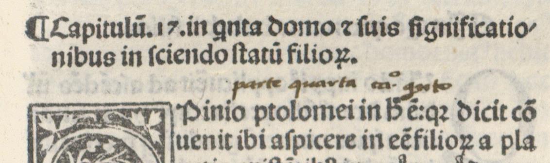 Copernicus’s Annotation Annotation ID: 24 Authentic: Authentic Non-Authentic Unknown Volume: Czartoryski number: 1 Library: Uppsala. Sign: Copernicana 6 #https://www.alvin-portal.org/alvin/view.jsf?dswid=9974&searchType=EXTENDED&query=&aq=%5B%5B%7B%22HOST%22%3A%22alvin-record%3A112350%22%7D%5D%5D&aqe=%5B%5D&af=%5B%5D&pid=alvin-record%3A54364&c=2#alvin-record%3A54364 Book: ID: 2 Author: Haly Albohazen. Title:In iudiciis astrorum https://www.alvin-portal.org/alvin/view.jsf?pid=alvin-record:54466 URL: https://www.alvin-portal.org/alvin/imageViewer.jsf?dsId=ATTACHMENT-0077&pid=alvin-record:54466 Folio: 74ra Image: [Download] Resolution dpi: Style: Terminus Post Quem: Terminus Ante Quem: Unknown Hand A (Gothic) Hand B (Humanistic) Mixed Comments: Scan page 77. B16. Sig. 74ra =Haly IV.17, on the meaning of the fifth house and children Added note: ‘Parte quarta capitulo quinto’, written above the beginning of ch. IV.17 opening Opinio Ptolomei in hoc est quia dicit convenit ibi aspicere in esse filiorum planetis existentibus…’. The reference is to Ptolemy’s Quadripartitum IV.5, on children. Volume Book Home Search Previous Back Next