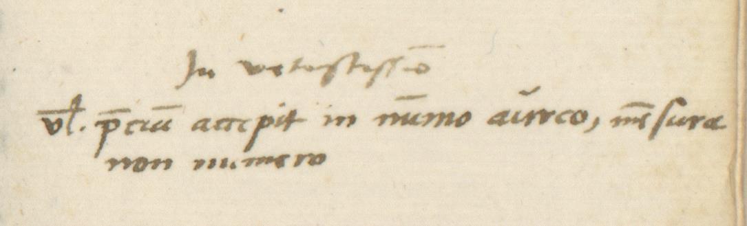 Copernicus’s Annotation Annotation ID: 25 Authentic: Authentic Non-Authentic Unknown Volume: Czartoryski number: 16 Library: Uppsala. Sign: Copernicana 12 https://www.alvin-portal.org/alvin/view.jsf?pid=alvin-record:80553 Book: ID: 1 Author: Plinius Secundus. Title:Historia naturalis https://www.alvin-portal.org/alvin/view.jsf?pid=alvin-record:80553 URL: https://www.alvin-portal.org/alvin/imageViewer.jsf?dsId=ATTACHMENT-0376&pid=alvin-record:80527 Folio: 372r Transcription: In vetustissimo vel precium accepit in nummo aureo, mensura, non numero German Translation: In einem sehr alten Exemplar: „Den Lohn erhielt er in goldener Münze, nach dem Maß, nicht nach der Zahl.“ Image: [Download] Resolution dpi: Style: Terminus Post Quem: Terminus Ante Quem: Unknown Hand A (Gothic) Hand B (Humanistic) Mixed Comments: Alvin's scan page 376 Volume Book Home Search Previous Back Next