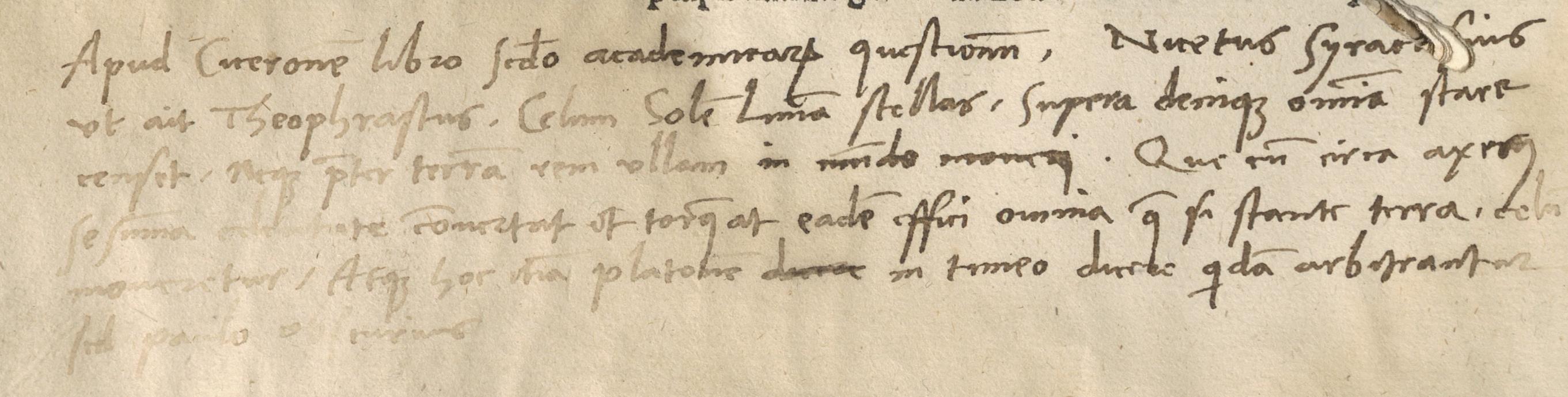 Copernicus’s Annotation Annotation ID: 1 Authentic: Authentic Non-Authentic Unknown Volume: Czartoryski number: 16 Library: Uppsala. Sign: Copernicana 12 https://www.alvin-portal.org/alvin/view.jsf?pid=alvin-record:80553 Book: ID: 1 Author: Plinius Secundus. Title:Historia naturalis https://www.alvin-portal.org/alvin/view.jsf?pid=alvin-record:80553 URL: https://www.alvin-portal.org/alvin/imageViewer.jsf?dsId=ATTACHMENT-0021&pid=alvin-record:80553 Folio: aIIv Transcription: Apud Ciceronem libro secundo academicarum questionum, Nicetus Syracusius vt ait Theophrastus, Celum Solem Lunam stellas, supera denique omnia stare censet, neque praeter terram rem vllam in mundo mouerj. Que cum circa axem se summa celeritate conuertat et torqueat eadem effici omnia que si stante terra, celum moueretur; Atque hoc etiam platonem in timeo dicere quidam arbitrantur, sed paulo obscurius. German Translation: Bei Cicero im zweiten Buch der „Academicae Quaestiones“: Der Syrakusaner Hiketas ist der Ansicht, wie Theophrast sagt, dass der Himmel, die Sonne, der Mond, die Sterne, schließlich alles oberhalb der Erde stillstehe und außer der Erde sich nichts in der Welt bewege. Während sich diese um ihre Achse mit höchster Geschwindigkeit drehe und wälze, werde alles auf dieselbe Weise bewirkt, als wenn bei stillstehender Erde der Himmel sich bewegen würde. Und einige glauben, dass dies auch Platon im „Timaeus“ sage, aber ein wenig undeutlicher. Image: [Download] Resolution dpi: Style: Terminus Post Quem: Terminus Ante Quem: Unknown Hand A (Gothic) Hand B (Humanistic) Mixed Comments: Alvin's scan page 21 Volume Book Home Search Previous Back Next