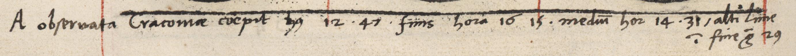 Copernicus’s Annotation Annotation ID: 12 Authentic: Authentic Non-Authentic Unknown Volume: Czartoryski number: 18 Library: Uppsala Library of the Astronomical Observatory. Sign: Coll. Hjorter G.I. 51 Book: ID: 1 Author: Stoeffler, Johannes. Title:Calendarium Romanum magnum, Caesaree maiestati dicatum https://www.alvin-portal.org/alvin/view.jsf?pid=alvin-record:80120 URL: https://www.alvin-portal.org/alvin/imageViewer.jsf?dsId=ATTACHMENT-0112&pid=alvin-record:80120 Folio: D2v Transcription: obseruata Cracouiae coepit hora 12.47 finis hora 16 15 medium hor[a] 14.31/ alti[tudo] Lune in fine gradus 29 German Translation: Beobachtet in Krakau, begann am 30. 1., 00:47 Uhr, Ende: 04:15 Uhr, Mitte: 02:31 Uhr/ Die Höhe des Mondes betrug am Ende 29◦ Image: [Download] Resolution dpi: Style: Terminus Post Quem: Terminus Ante Quem: Unknown Hand A (Gothic) Hand B (Humanistic) Mixed Comments: Alvin's scan page 112 Volume Book Home Search Previous Back Next