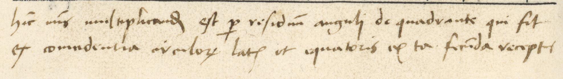 Copernicus’s Annotation Annotation ID: 5 Authentic: Authentic Non-Authentic Unknown Volume: Czartoryski number: 2 Library: Uppsala. Sign: Copernicana 4 https://www.alvin-portal.org/alvin/view.jsf?pid=alvin-record:112344 Book: ID: 2 Author: Regiomontanus, Johannes. Title:Tabulae directionum et profectionum https://www.alvin-portal.org/alvin/view.jsf?pid=alvin-record:111080 URL: https://www.alvin-portal.org/alvin/imageViewer.jsf?dsId=ATTACHMENT-0021&pid=alvin-record:111080 Folio: f4v Transcription: Hic numerus multiplicandus est per residuum angulj de quadrante qui fit ex coincidentia circulorum latitudinis et equatoris ex ta[bula] secunda receptum German Translation: Diese Zahl ist mit dem aus der Tabula secunda erhaltenen [Tangens des] Komplement[s] zu 90◦ des Winkels, der sich aus dem Zusammentreffen von Breitenkreis123 und Äquator ergibt, zu multiplizieren. Image: [Download] Resolution dpi: Style: Terminus Post Quem: Terminus Ante Quem: Unknown Hand A (Gothic) Hand B (Humanistic) Mixed Comments: Alvin's scan page 21 Volume Book Home Search Previous Back Next