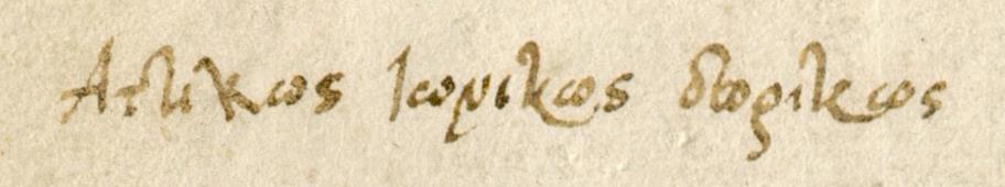 Copernicus’s Annotation Annotation ID: 8 Authentic: Authentic Non-Authentic Unknown Volume: Czartoryski number: 3 Library: Uppsala. Sign: Copernicana 5 https://www.alvin-portal.org/alvin/view.jsf?pid=alvin-record:80408 Book: ID: 1 Author: Crastonus, Johannes. Title:Dictionarium graecum cum interpretatione latina https://www.alvin-portal.org/alvin/view.jsf?pid=alvin-record:80408 URL: https://www.alvin-portal.org/alvin/imageViewer.jsf?dsId=ATTACHMENT-0302&pid=alvin-record:80408 Folio: letzten Blattes Transcription: Αττικως Ιωνικως δωρικως German Translation: die die drei Dialekte der griechischen Sprache nennt Image: [Download] Resolution dpi: Style: Terminus Post Quem: Terminus Ante Quem: Unknown Hand A (Gothic) Hand B (Humanistic) Mixed Comments: Alvin's scan page 302 Volume Book Home Search Previous Back Next