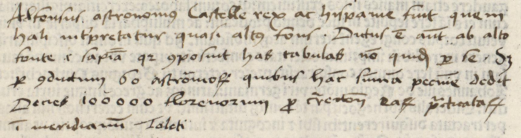 Copernicus’s Annotation Annotation ID: 3 Authentic: Authentic Non-Authentic Unknown Volume: Czartoryski number: 2 Library: Uppsala. Sign: Copernicana 4 https://www.alvin-portal.org/alvin/view.jsf?pid=alvin-record:112344 Book: ID: 1 Author: Alfonsus X. Title:Tabulae astronomicae https://www.alvin-portal.org/alvin/view.jsf?pid=alvin-record:111078 URL: https://www.alvin-portal.org/alvin/imageViewer.jsf?dsId=ATTACHMENT-0005&pid=alvin-record:111078 Folio: A2v Transcription: Alfonsus astronomus Castelle rex ac hispanie fuit, quem Hali interpretatur quasi altus fons. Dictus est autem ab alto fonte, id est sapientia, quia composuit has tabulas non quidem per se, Sed per conductum 60 astronomorum, quibus hanc summam pecunie dedit Decies 100000 florenorum pro correctione tabularum practicatarum in meridianum Toleti. German Translation: Der Astronom Alfons war König von Kastilien und Spanien. Haly Abenrudian deutet den Namen gleichsam als „altus fons“ („tiefe Quelle“). Er ist aber nach „tiefer Quelle“ benannt, d. h. Weisheit, da er diese Tafeln zusammenstellte, allerdings nicht selbst, sondern durch die Zusammenbringung von 60 Astronomen, denen er folgende Geldsumme gab: 1 Million Gulden für die Korrektur astronomischer Tafeln, erstellt für den Meridian von Toledo. English Translation: The astronomer Alfonso was King of Castile and Spain. Haly [Abenrudian] interprets the name as the "deep source". He is called the "deep source", that is wisdom, because he compiled these tables, not by himself, however, but by bringing together 60 astronomers, to whom he gave the following sum of money a million 100000 florins for the correction of the astronomical tables used in the South of Toledo [Tables of Toledo].. Image: [Download] Resolution dpi: Style: Terminus Post Quem: Terminus Ante Quem: Unknown Hand A (Gothic) Hand B (Humanistic) Mixed Comments: Alvin's scan page 5 Volume Book Home Search Previous Back Next