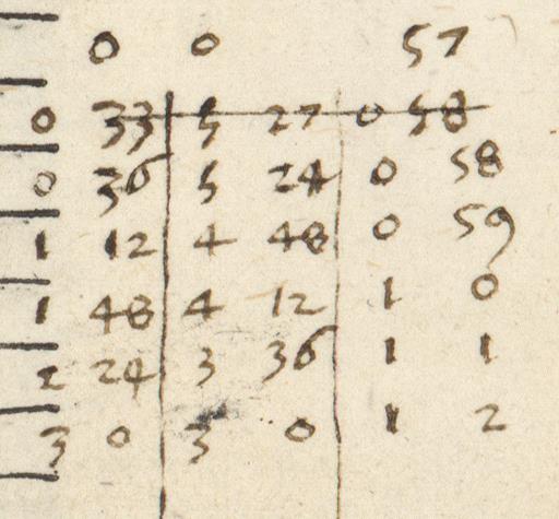 Copernicus’s Annotation Annotation ID: 23 Authentic: Authentic Non-Authentic Unknown Volume: Czartoryski number: 2 Library: Uppsala. Sign: Copernicana 4 https://www.alvin-portal.org/alvin/view.jsf?pid=alvin-record:112344 Book: ID: 1 Author: Alfonsus X. Title:Tabulae astronomicae https://www.alvin-portal.org/alvin/view.jsf?pid=alvin-record:111078 URL: https://www.alvin-portal.org/alvin/imageViewer.jsf?dsId=ATTACHMENT-0100&pid=alvin-record:111078 Folio: h4r German Translation: Der Abschnitt „33 5 27 0 58“ in der 2. Zeile ist durchgestrichen. Die Tabelle ist, wie L. A. Birkenmajer erkannt hat, eine Kurzfassung der auf diesem Blatt stehenden Tafel der Bewegung der Sonne in einer sexagesimalen Minute des Tages. Image: [Download] Resolution dpi: Style: Terminus Post Quem: Terminus Ante Quem: Unknown Hand A (Gothic) Hand B (Humanistic) Mixed Comments: Alvin's scan page 100 Volume Book Home Search Previous Back Next