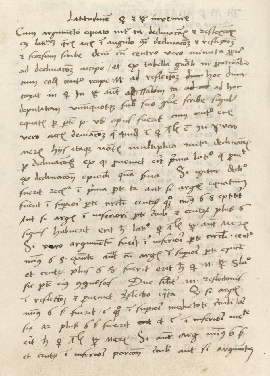 Copernicus’s Annotation Annotation ID: 20 Authentic: Authentic Non-Authentic Unknown Volume: Czartoryski number: 2 Library: Uppsala. Sign: Copernicana 4 https://www.alvin-portal.org/alvin/view.jsf?pid=alvin-record:112344 Book: ID: 3 Author: Copernicus. Title:The Uppsala Notebook https://www.alvin-portal.org/alvin/view.jsf?pid=alvin-record:113092 URL: https://www.alvin-portal.org/alvin/imageViewer.jsf?dsId=ATTACHMENT-0012&pid=alvin-record:113092 Folio: 11v Transliteration: Latitudinem ♀ et ☿ invenire Cum argumento aequato intra ta[bulam] declinacionis et reflexionis, cuius latitudinem quaeris, accipe in angulo communi declinacionem et reflexionem, et seorsum scribe. Deinde cum centro vero minuta proportionalia ad declinacionem accipe, et ex tabella generali minutorum proporcionalium cum eodem centro recipe minuta ad reflectionem; hoc dumtaxat in ♀. In ☿ autem a...ssalem (?) tabulam ad hoc deputatam. Vnumquotque sub suo genere scribe singulis aequatis per partem p[roportionalem], ubi opus fuerit. Cum centro eius vero accipe deviacionem, quae quidem in ♀ septemtrionalis est, in ☿ vero meridionalis. His itaque notatis multiplica minuta declinacionis per declinacionem, et quod proveniet, erit prima latitudo, quae provenit ex declinacione epicicli, quam serva. Si igitur declinacio fuerit reperta in prima parte ta[bule], aut si argumentum equatum fuerit in superiori parte circuli, centrum quoque minus 6 s[ignis] extiterit, aut si argumentum in inferiori parte circuli et centrum plus 6 signis habuerit, erit haec latitudo ♀ septemtrionalis, ☿ autem meridionalis. Si vero argumentum fuerit in inferiori parte circuli centro minus 6 signis existente, aut cum argumentum in superiori parte epicicli et centrum plus 6 signis fuerit, erit haec ♀ meridionalis, ☿ septemtrionalis latitudo; sic partem eius cognosces. Duc similiter minuta reflectionis in reflectionem, et proveniet reflectio equata. Quodsi argumentum minus 6 signis fuerit, centrum quoque in superiori medietate circuli, aut si argumentum plus 6 signis fuerit et centrum in inferiori medietate, erit haec ♀ septemtrionalis, ☿ meridionalis. Si autem argumentum minus 6 signis et centrum in inferiori porcione circuli, aut si argumentum Transcription: Latitudinem ♀ et ☿ invenire Cum argumento aequato intra ta[bulam] declinacionis et reflexionis, cuius latitudinem quaeris, accipe in angulo communi declinacionem et reflexionem, et seorsum scribe. Deinde cum centro vero minuta proportionalia ad declinacionem accipe, et ex tabella generali minutorum proporcionalium cum eodem centro recipe minuta ad reflectionem; hoc dumtaxat in ♀. In ☿ autem a...ssalem (?) tabulam ad hoc deputatam. Vnumquotque sub suo genere scribe singulis aequatis per partem p[roportionalem], ubi opus fuerit. Cum centro eius vero accipe deviacionem, quae quidem in ♀ septemtrionalis est, in ☿ vero meridionalis. His itaque notatis multiplica minuta declinacionis per declinacionem, et quod proveniet, erit prima latitudo, quae provenit ex declinacione epicicli, quam serva. Si igitur declinacio fuerit reperta in prima parte ta[bule], aut si argumentum equatum fuerit in superiori parte circuli, centrum quoque minus 6 s[ignis] extiterit, aut si argumentum in inferiori parte circuli et centrum plus 6 signis habuerit, erit haec latitudo ♀ septemtrionalis, ☿ autem meridionalis. Si vero argumentum fuerit in inferiori parte circuli centro minus 6 signis existente, aut cum argumentum in superiori parte epicicli et centrum plus 6 signis fuerit, erit haec ♀ meridionalis, ☿ septemtrionalis latitudo; sic partem eius cognosces. Duc similiter minuta reflectionis in reflectionem, et proveniet reflectio equata. Quodsi argumentum minus 6 signis fuerit, centrum quoque in superiori medietate circuli, aut si argumentum plus 6 signis fuerit et centrum in inferiori medietate, erit haec ♀ septemtrionalis, ☿ meridionalis. Si autem argumentum minus 6 signis et centrum in inferiori porcione circuli, aut si argumentum German Translation: Auffinden der Breite der Venus und des Merkur Gehe mit dem korrigierten Argument in die Tafel der Deklination und der Reflexion desjenigen Planeten, dessen Breite du suchst, entnimm beim gemeinsamen Winkel den Wert für Deklination und Reflexion und notiere ihn gesondert. Dann entnimm mit dem wahren Zentrum die Proportionalminuten für die Deklination und mit demselben Zentrumswert aus der allgemeinen Tafel der Proportionalminuten die Minuten für die Reflexion; dies zumindest bei der Venus. Beim Merkur aber nimm die hierfür bestimmte Tafel. Notiere ein jedes unter seiner Art, nachdem die einzelnen Werte durch den Proportionalteil korrigiert worden sind, wo es nötig ist. Entnimm mit dem wahren Zentrumswert die Deviation, die für Venus nördlich ist, für Merkur aber südlich. Nachdem dies notiert worden ist, multipliziere die Minuten der Deklination mit der Deklination. Was dabei herauskommt, wird die erste Breite sein, die aus der Deklination des Epizykels stammt; notiere sie. Wenn also die Deklination im ersten Teil der Tafel aufgefunden wird, oder wenn das korrigierte Argument sich im oberen Teil des Kreises befindet, ferner der Zentrumswert weniger als sechs Zeichen [à 30°] beträgt, oder wenn sich das Argument im unteren Teil des Kreises befindet und der Zentrumswert mehr als sechs Zeichen beträgt, so wird diese Breite der Venus nördlich, die des Merkur aber südlich sein. Wenn sich aber das Argument im unteren Teil des Kreises befindet und der Zentrumswert weniger als sechs Zeichen beträgt, oder wenn sich das Argument im oberen Teil des Epizykels befindet und der Zentrumswert mehr als sechs Zeichen beträgt, so wird diese Breite der Venus südlich, die des Merkur aber nördlich sein. So wirst du ihren Abschnitt11 erkennen. Multipliziere auf analoge Weise die Minuten der Reflexion mit der Reflexion, und es wird die korrigierte Reflexion dabei herauskommen. Wenn nun das Argument weniger als sechs Zeichen betragen, ferner das