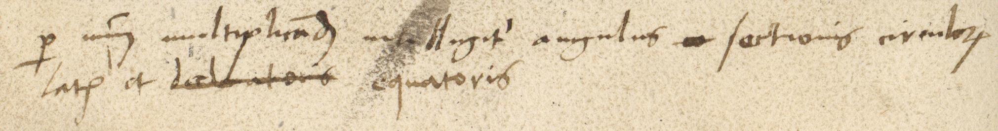 Copernicus’s Annotation Annotation ID: 3 Authentic: Authentic Non-Authentic Unknown Volume: Czartoryski number: 2 Library: Uppsala. Sign: Copernicana 4 https://www.alvin-portal.org/alvin/view.jsf?pid=alvin-record:112344 Book: ID: 2 Author: Regiomontanus, Johannes. Title:Tabulae directionum et profectionum https://www.alvin-portal.org/alvin/view.jsf?pid=alvin-record:111080 URL: https://www.alvin-portal.org/alvin/imageViewer.jsf?dsId=ATTACHMENT-0008&pid=alvin-record:111080 Folio: d7v Transcription: per numerum multiplicandum intelligitur angulus sectionis circulorum latitudinis et equatoris German Translation: Unter „zu multiplizierender Zahl“ versteht man den [Sinus des] Schnittwinkel[s] zwischen dem Breitenkreis und dem Äquator. Image: [Download] Resolution dpi: Style: Terminus Post Quem: Terminus Ante Quem: Unknown Hand A (Gothic) Hand B (Humanistic) Mixed Comments: Alvin's scan page 8 Volume Book Home Search Previous Back Next