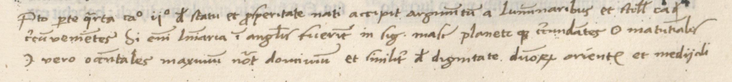 Copernicus’s Annotation Annotation ID: 2 Authentic: Authentic Non-Authentic Unknown Volume: Czartoryski number: 1 Library: Uppsala. Sign: Copernicana 6 #https://www.alvin-portal.org/alvin/view.jsf?dswid=9974&searchType=EXTENDED&query=&aq=%5B%5B%7B%22HOST%22%3A%22alvin-record%3A112350%22%7D%5D%5D&aqe=%5B%5D&af=%5B%5D&pid=alvin-record%3A54364&c=2#alvin-record%3A54364 Book: ID: 2 Author: Haly Albohazen. Title:In iudiciis astrorum https://www.alvin-portal.org/alvin/view.jsf?pid=alvin-record:54466 URL: https://www.alvin-portal.org/alvin/imageViewer.jsf?dsId=ATTACHMENT-0071&pid=alvin-record:54466 Folio: 68r Transcription: Pto[lemaeus] parte quarta capitulo secundo de statu et prosperitate nati accipit argumentum a luminaribus et stellis eadem circumvenientes. Si enim luminaria in angulis fuerint in sig[nis] masc[ulinis] planeteque circumdantes ☉ matutinales, ☽ vero occidentales, maximum notat dominium et similiter de dignitate dominorum orientis et medij celi German Translation: Ptolemaeus argumentiert im 4. Teil [seines Quadripartitum] im 2. Kapitel über den Stand und den Erfolg des Geborenen anhand der euchten und Sterne, die dieselben umgeben. Wenn sich nämlich die Leuchten in den Eckhäusern in männlichen Zeichen befinden und die Planeten, die die Sonne umgeben, morgendliche, diejenigen aber, die den Mond umgeben, abendliche sein sollten, deutet ihm dies auf die höchste Herrschaft, und auf ähnliche Weise bezüglich der Würde der Beherrscher des Aszendenten und der Himmelsmitte. Image: [Download] Resolution dpi: Style: Terminus Post Quem: Terminus Ante Quem: Unknown Hand A (Gothic) Hand B (Humanistic) Mixed Comments: Alvin's scan page 71 Volume Book Home Search Previous Back Next